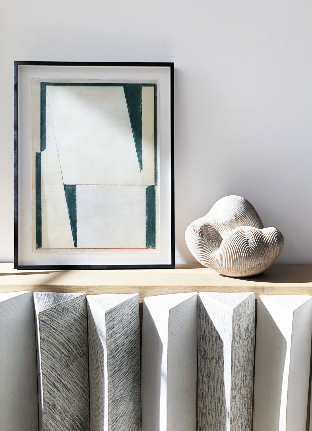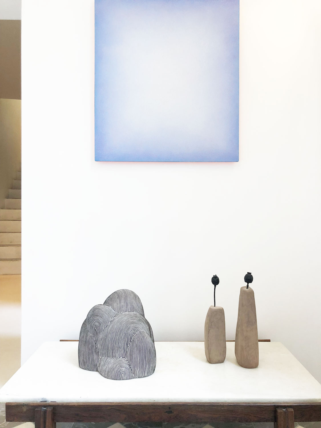 Dominique Mercadal’s formal vocabulary evokes geological layers, waves, clouds, flows. But above all, one feels an internal movement. The glaze, applied in fine layers, acts like a veil, revealing underlying tensions. Her pieces breathe, quite literally: they have a rhythm, a texture, a density that invites a tactile gaze.