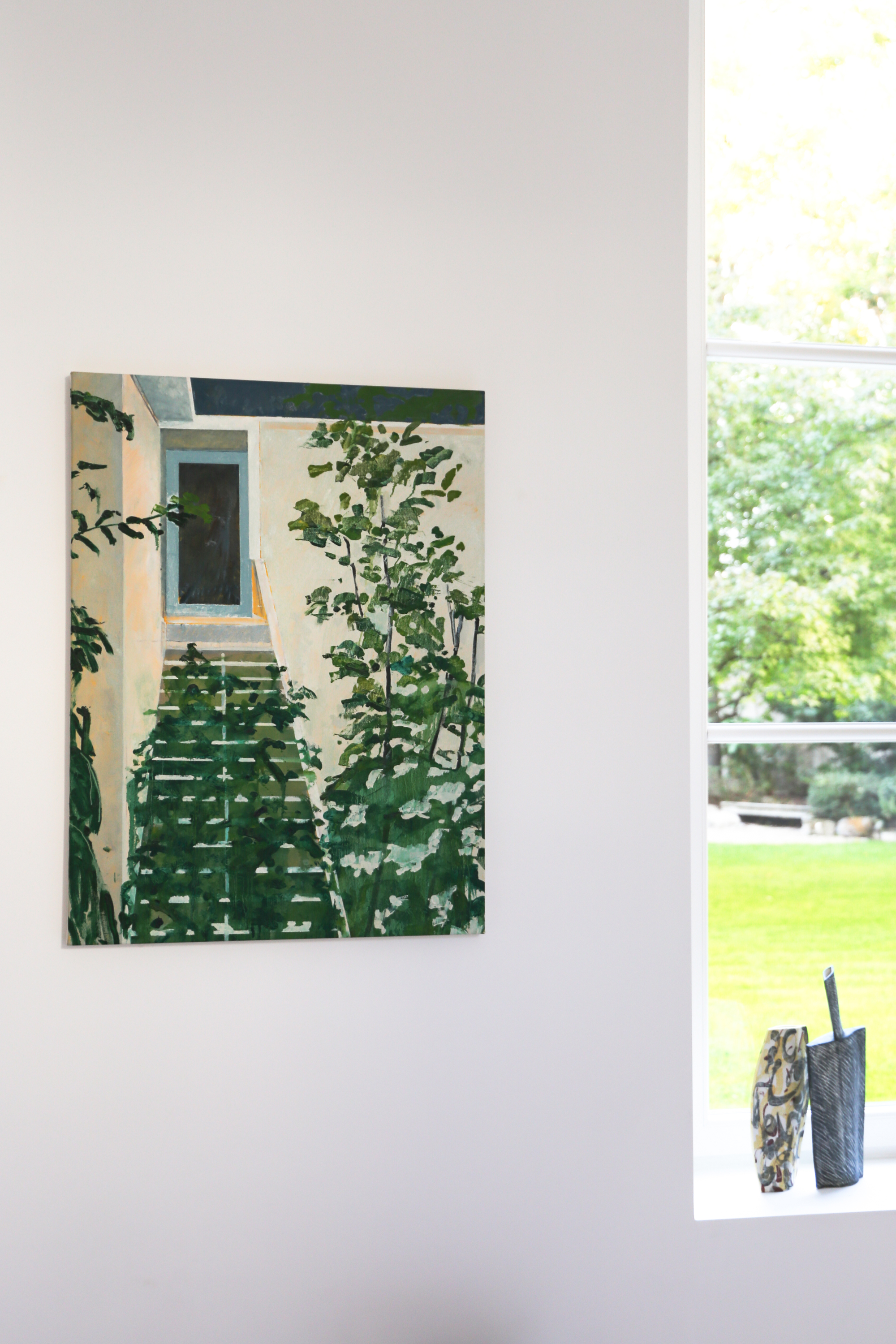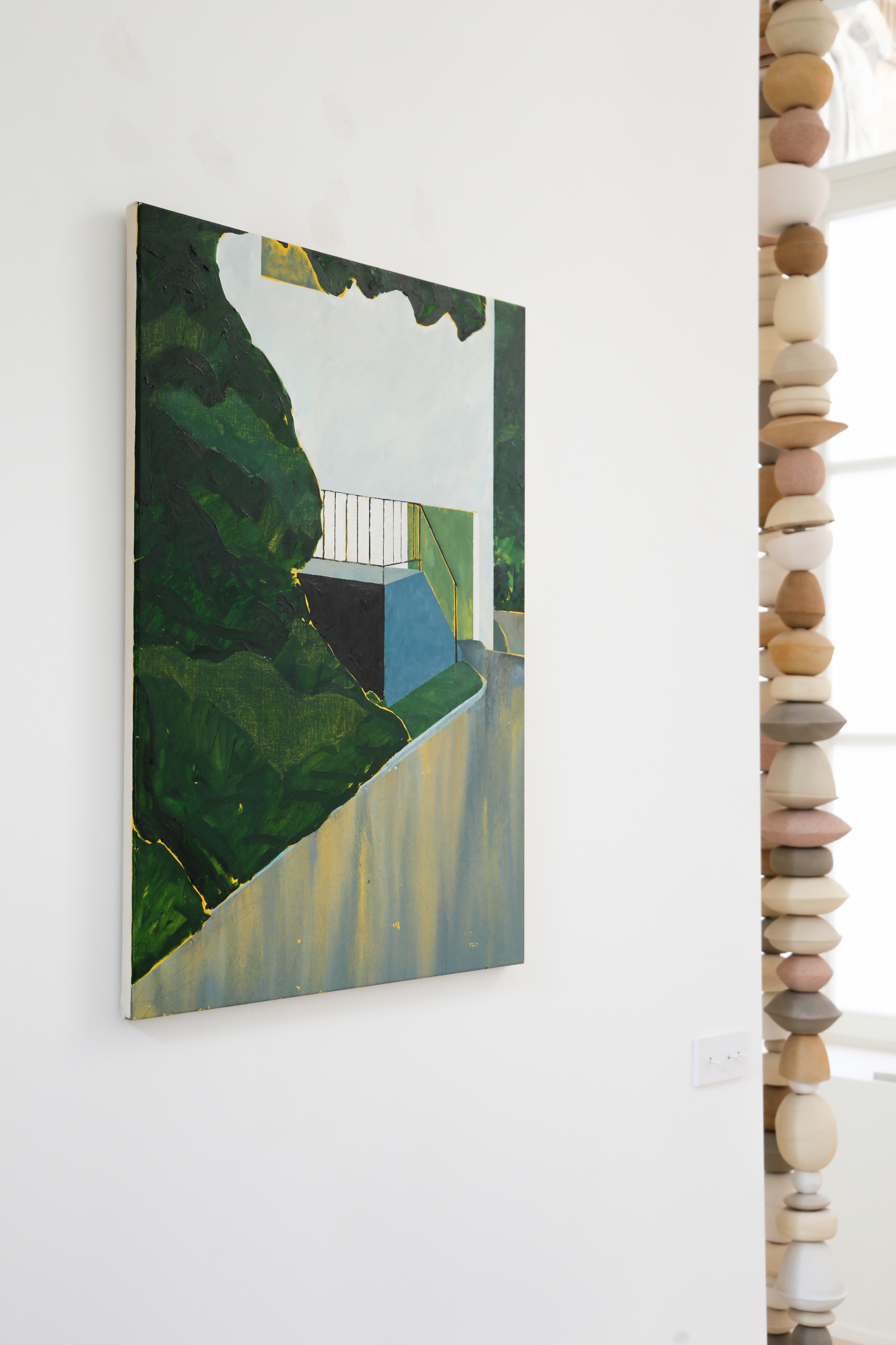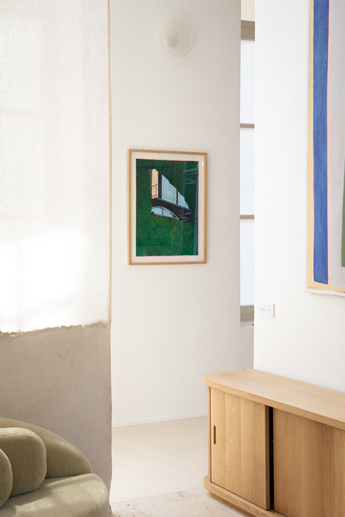In his architectural landscape paintings - Nick studied architecture - he captures the hazy glow and saturated tones of California. Depicting modernist buildings, power lines and cars against a background of green hills and trees, his paintings focus on the relationship between nature and the built environment. Painted from snapshots, McPhail's works offer somewhat voyeuristic views of anonymous buildings that emerge from behind fences and shrubs or from the tops of isolated hills. As if we were hidden with him behind a bush or a car.