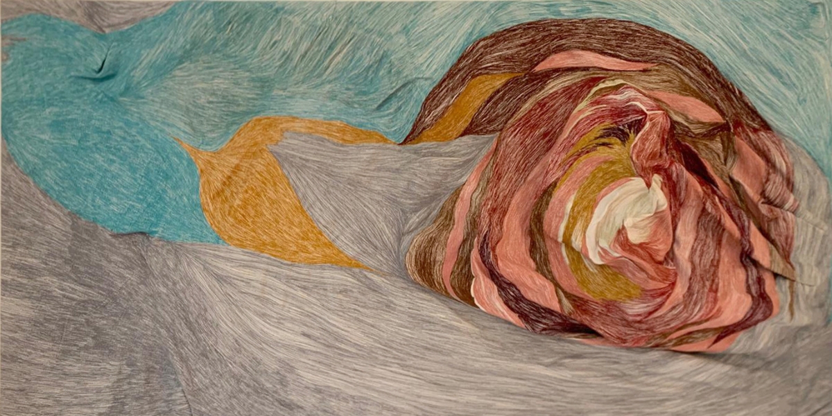 Exploring the sculptural and symbolic powers of thread, Camille Mugnier constructs relief canvases, line by line, much like a poet weaves her verses onto paper. Her work is the result of a lengthy process of shaping the material through thread and color. By developing her own tools for weaving and needle painting, Camille creates sculptures that unfold in space like growing organic forms.