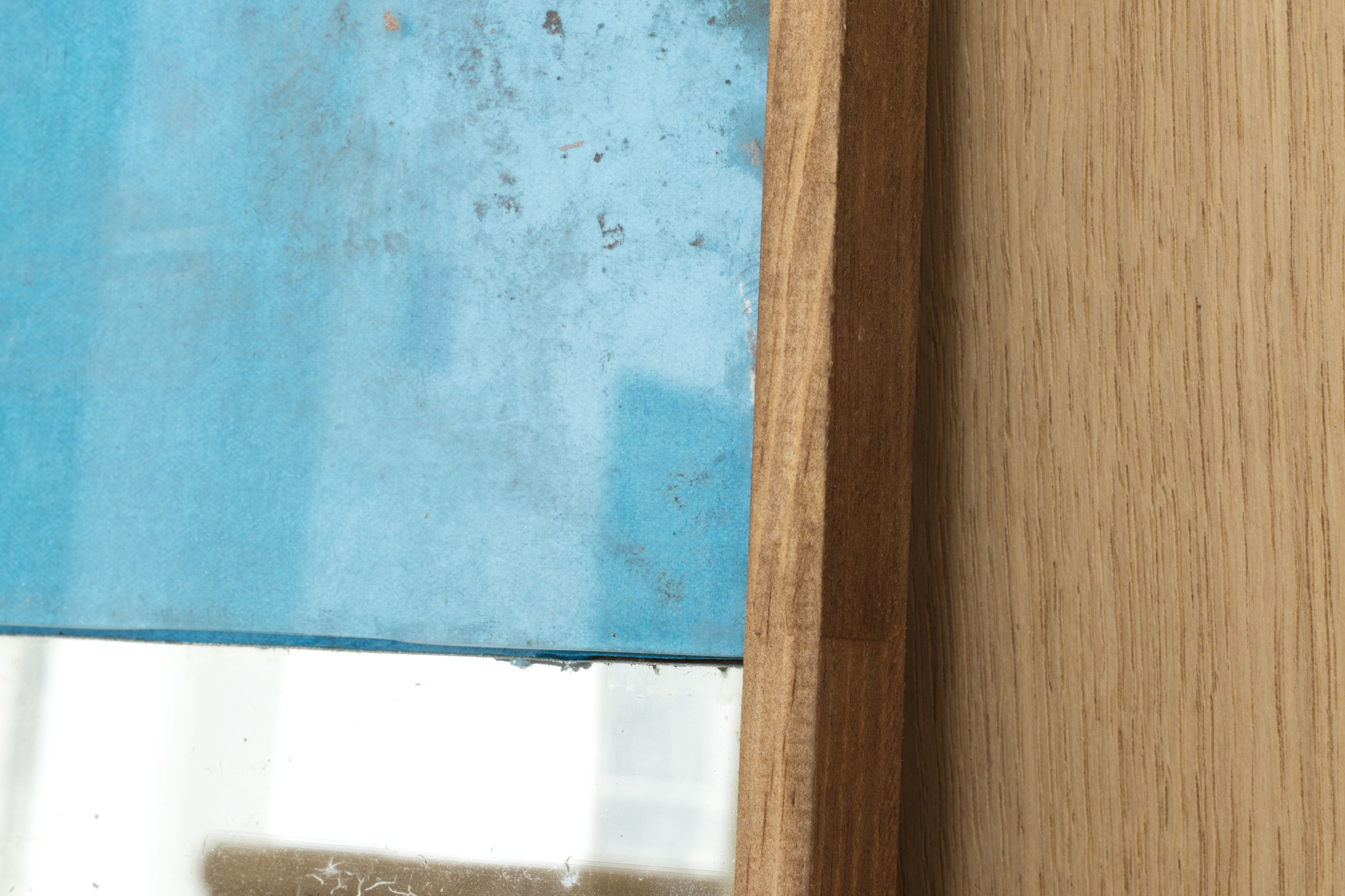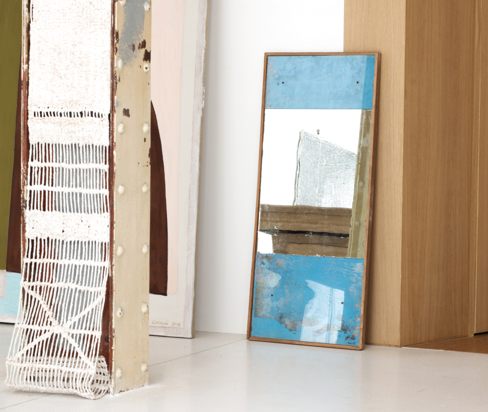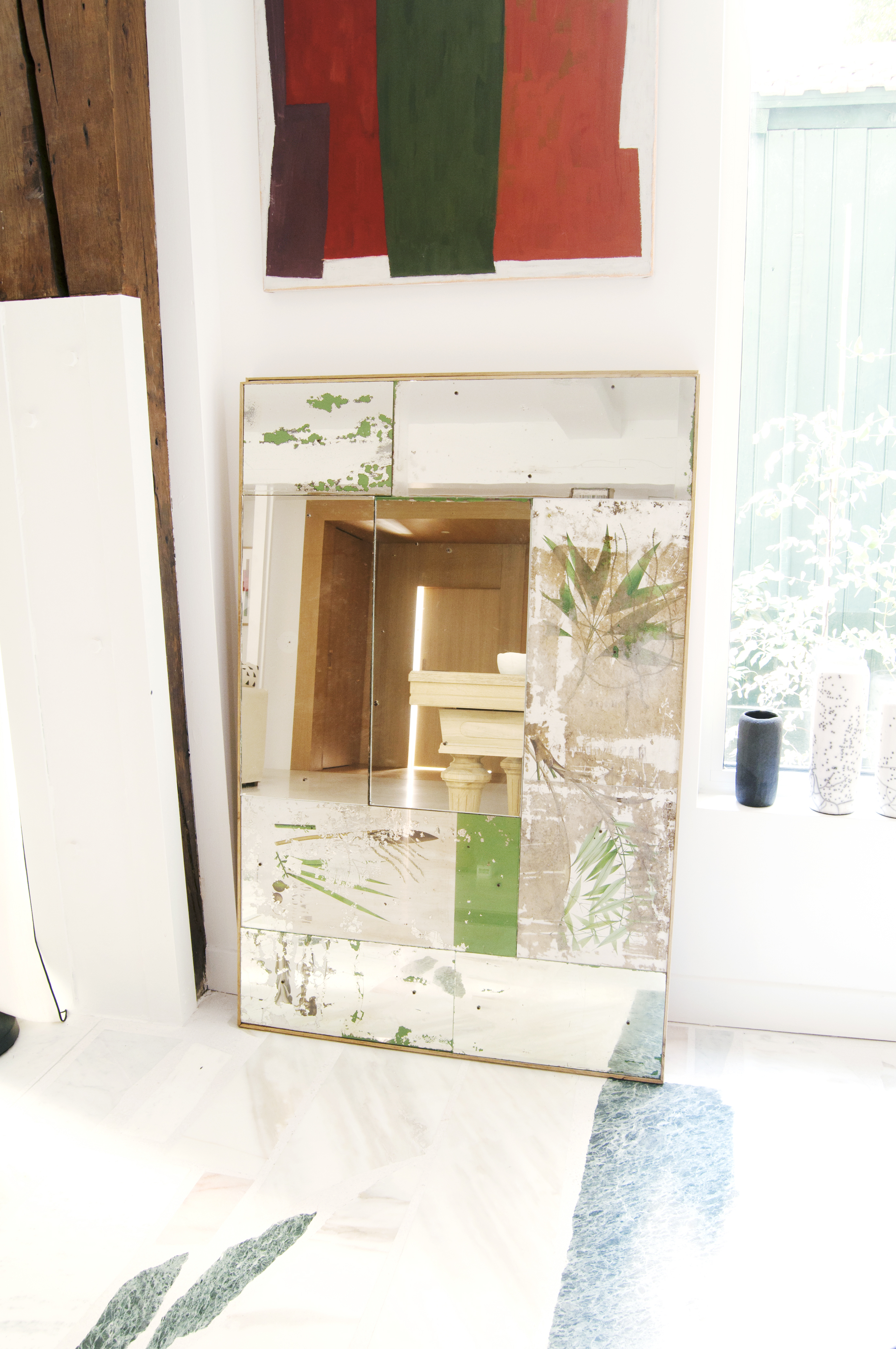 C’est au cours de ses voyages que Mathilde Labrouche rassemble ces miroirs d’un autre temps, qu’elle vient découper, recomposer, assembler puis travailler avec des inserts de papiers peints anciens. On y devine souvent un motif suggestif - une branche, une feuille, une fleur - ou juste de la patine, de l’usure, du temps qui passe.
