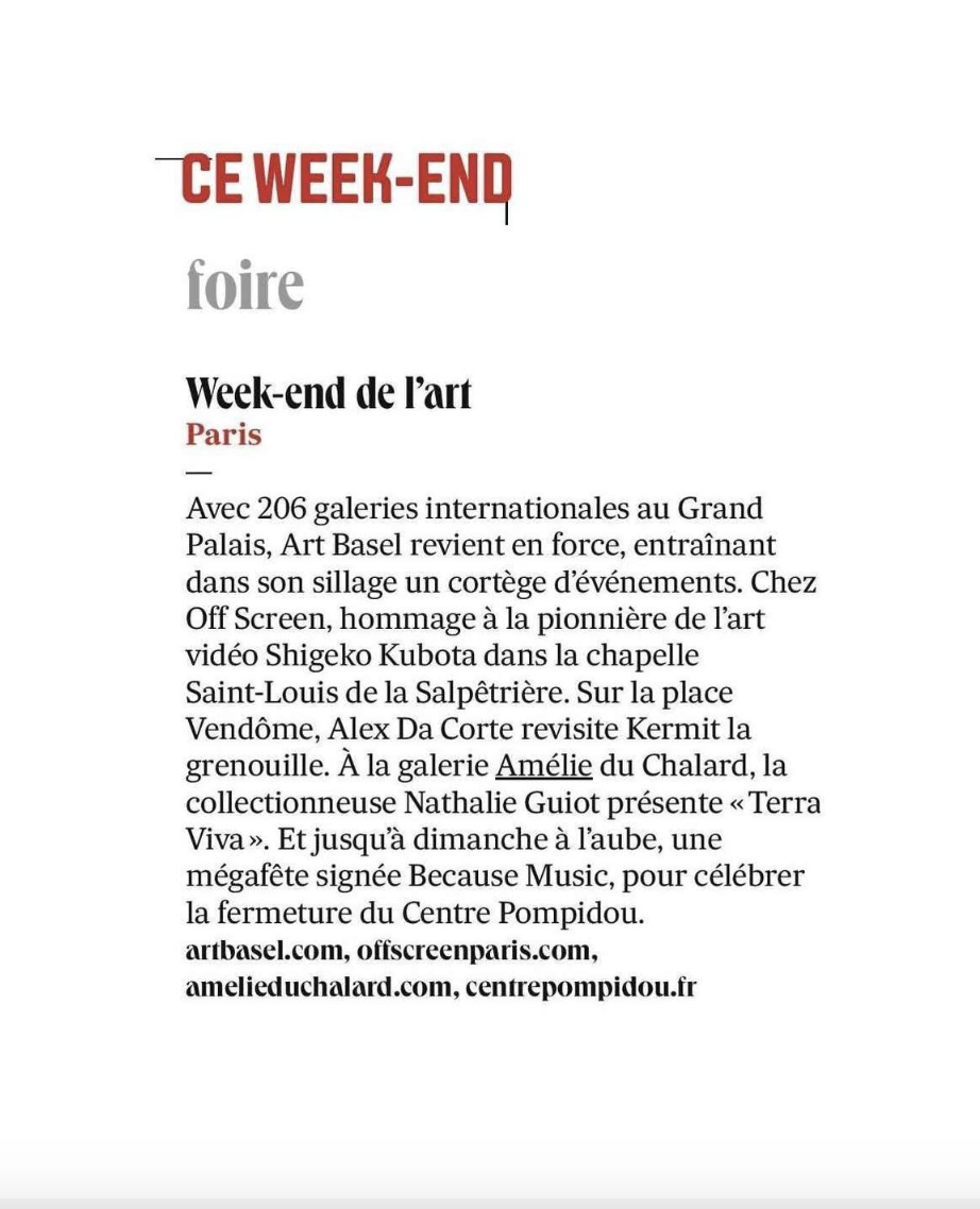 Un grand merci à Les Échos Week-End pour cette belle mention dans leur sélection du « Week-end de l’art ». Nous sommes ravis que l’exposition “Terra Viva”, présentée à la Galerie Amélie du Chalard en collaboration avec Nathalie Guiot, y figure aux côtés de si beaux événements célébrant la création contemporaine.