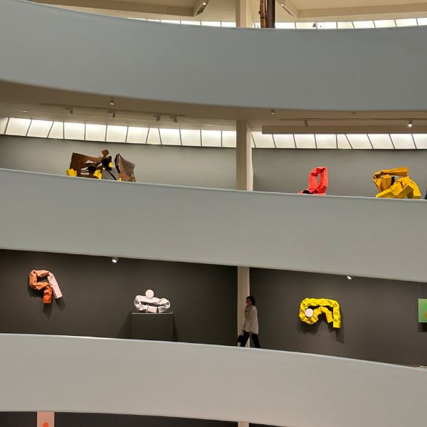 La magie de cette balade réside dans l'interaction entre les œuvres et l'architecture hélicoïdale de Frank Lloyd Wright. Contrairement à une galerie classique, la scénographie locale au Guggenheim utilise les rampes et les alcôves pour créer des points de vue cinématographiques. Tous les murs ont été repeints et évoluent au fur et à mesure de l'ascension.