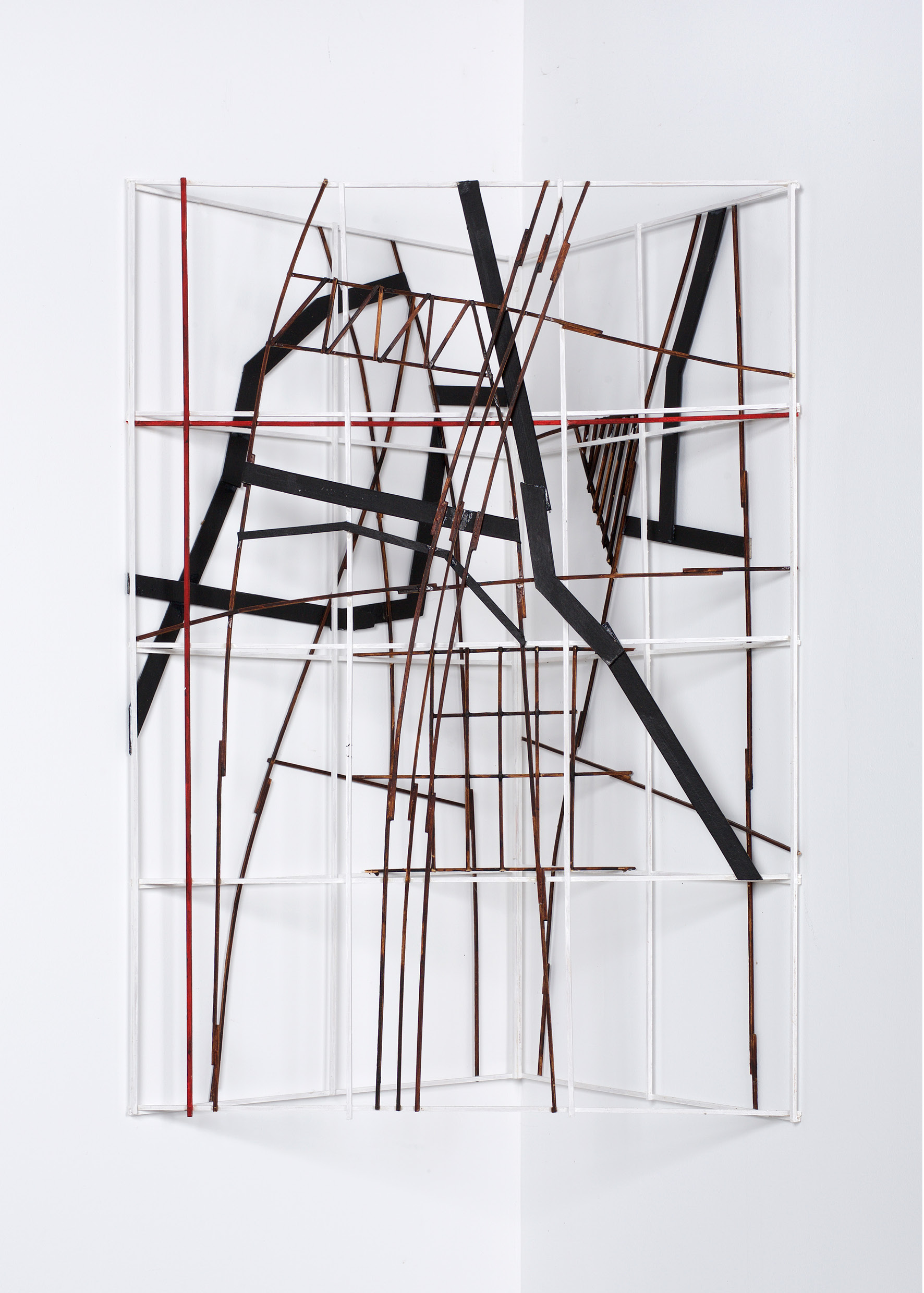 Ces structures linéaires constituées de fines baguettes de bois peint sont séparées du mur de quelques centimètres créant ainsi par le jeu de leur ombre portée un « dessin projeté » de leur composition.