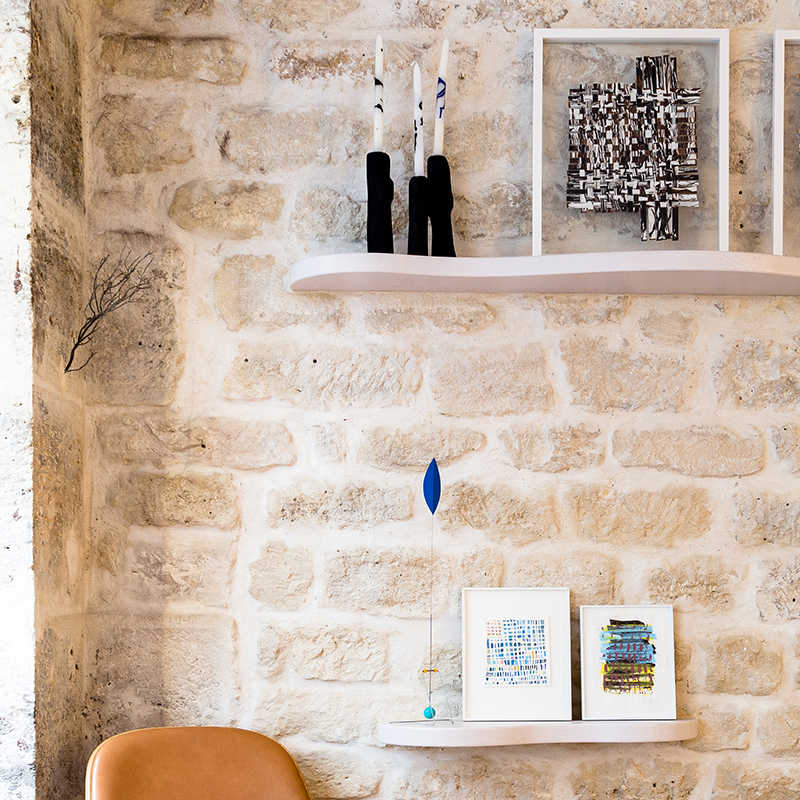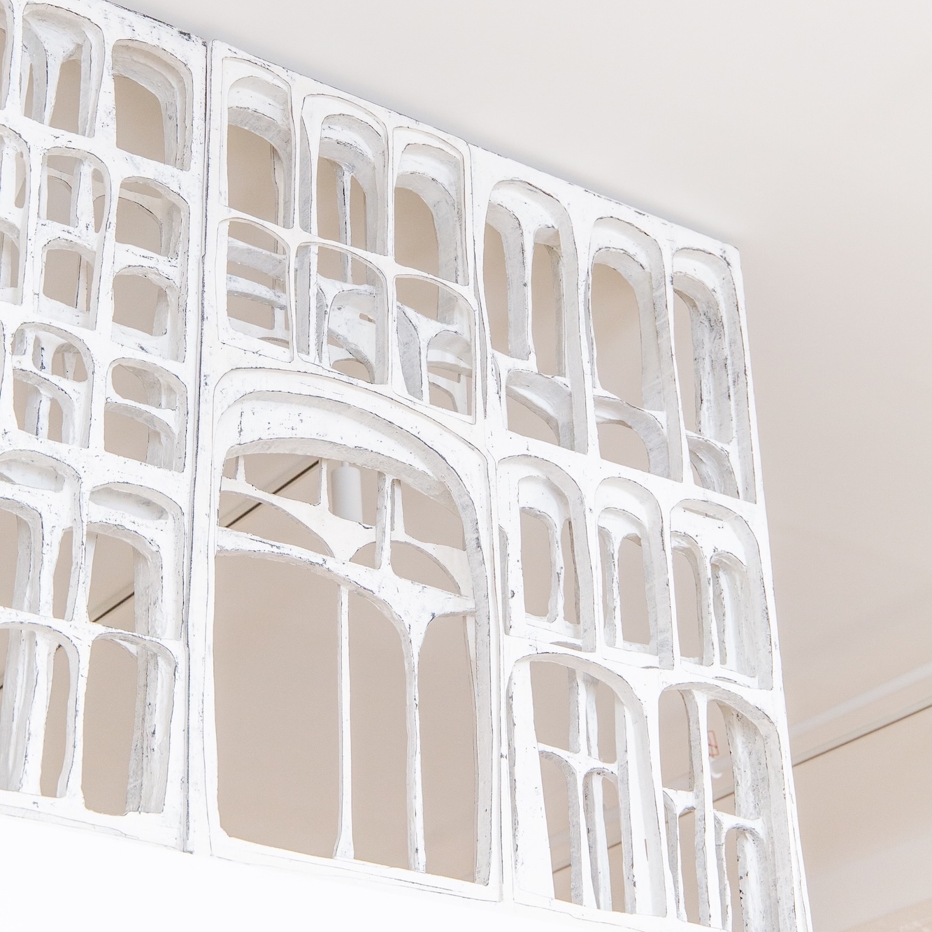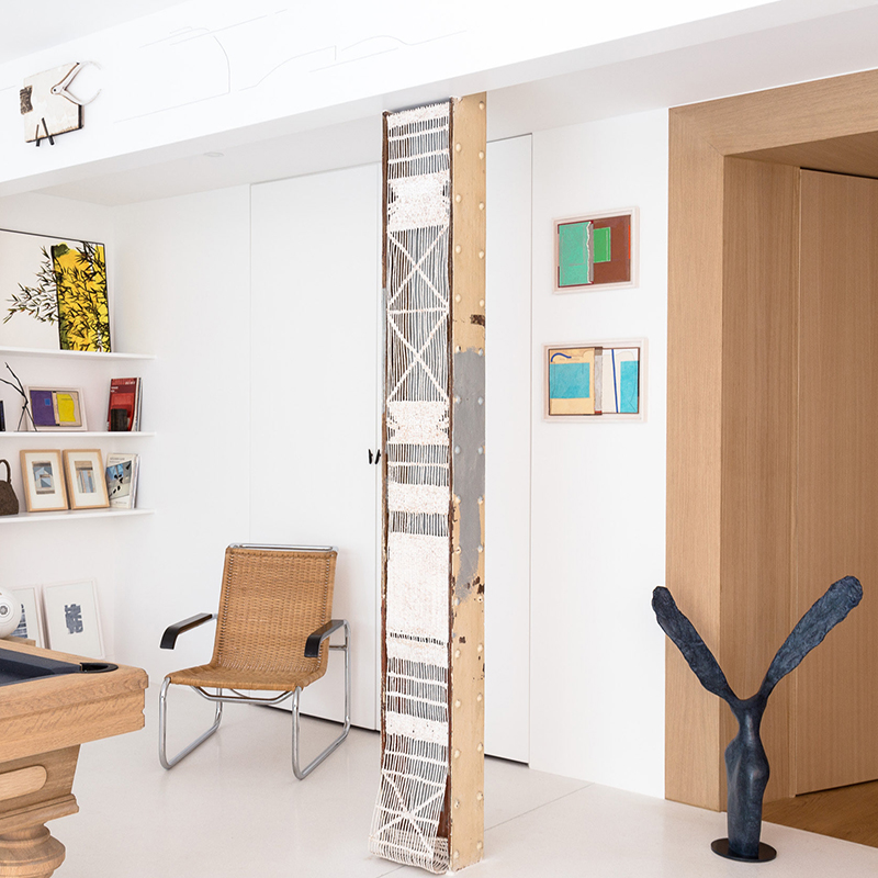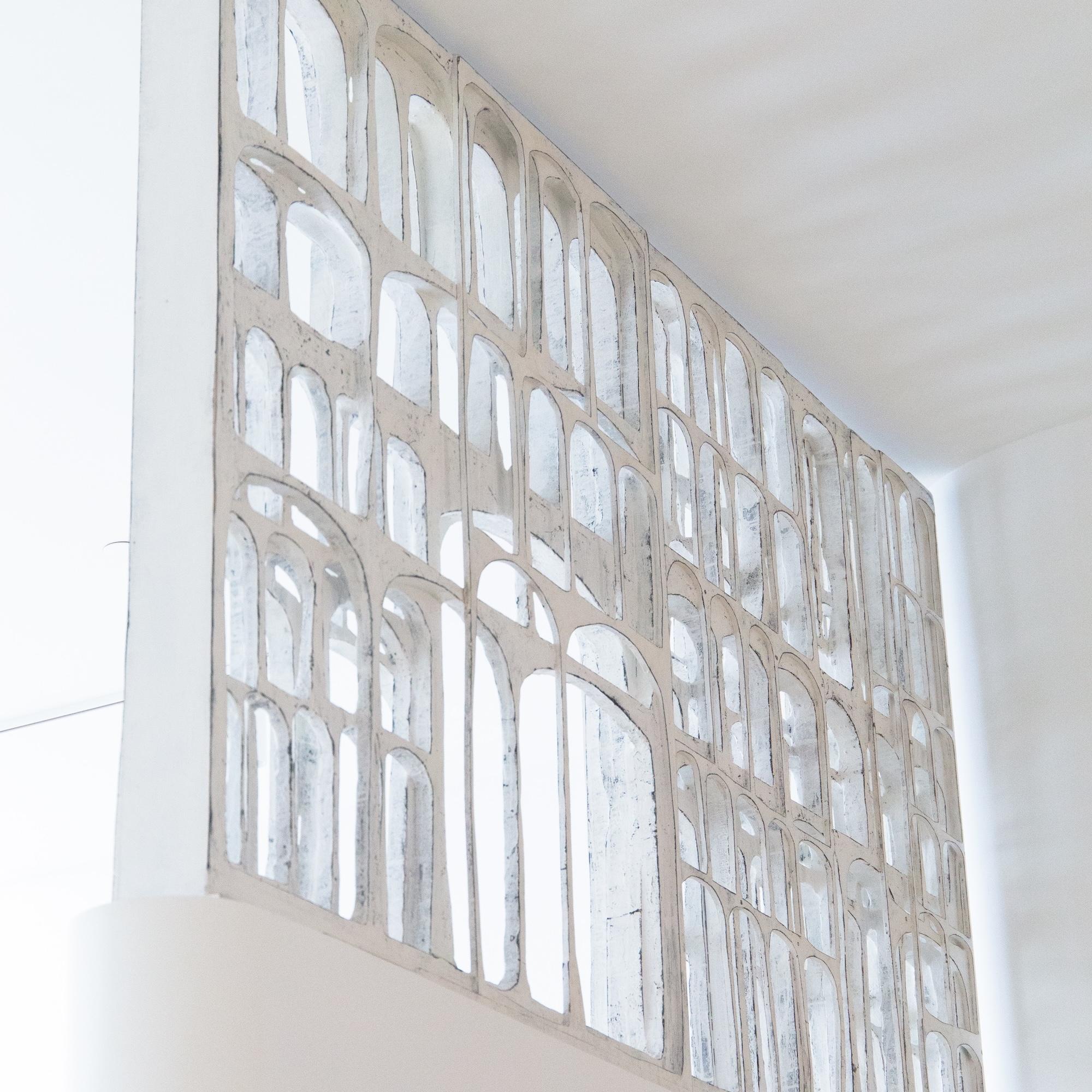 En surplomb, une composition murale de Gerd Kanz joue avec la lumière et la matière. Ce réseau de formes ajourées, entre structure et sculpture, filtre l’espace et dessine des ombres mouvantes, conférant à l’ensemble une présence à la fois architecturale et poétique.
