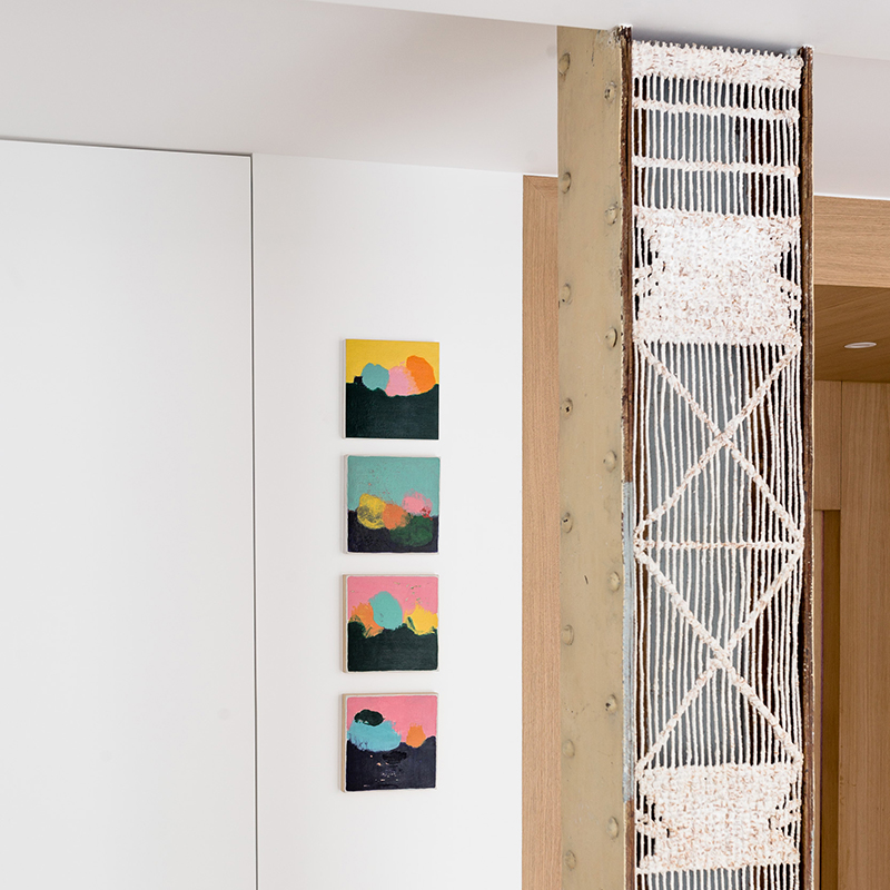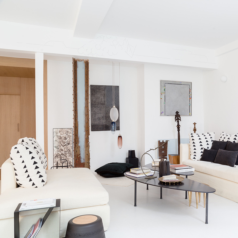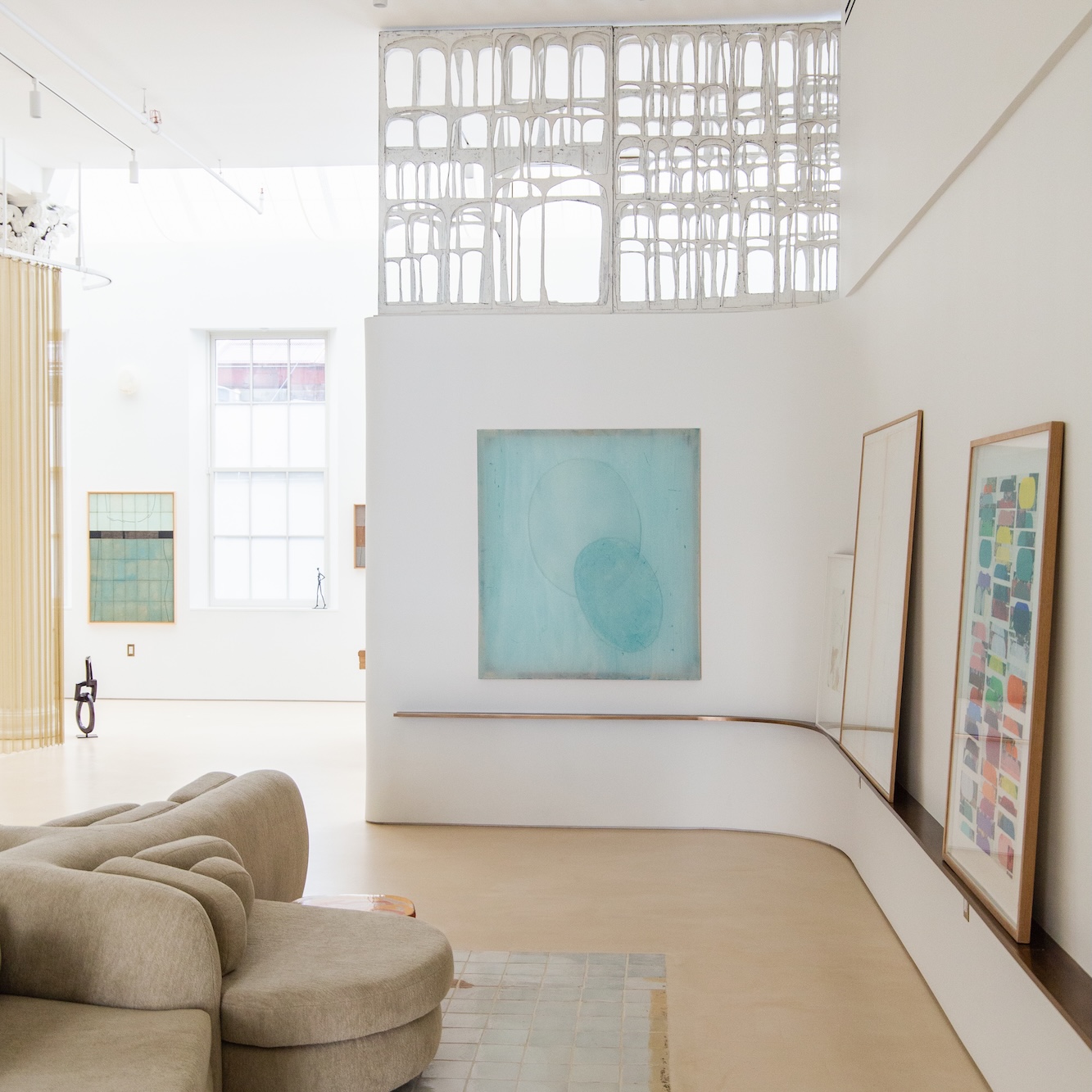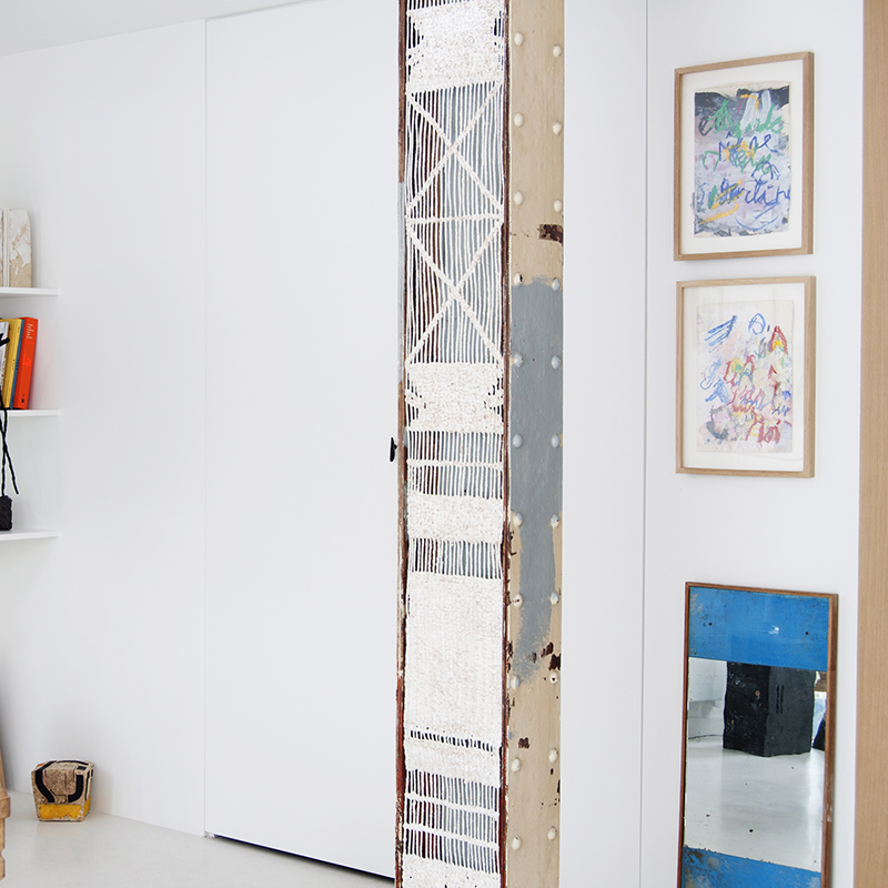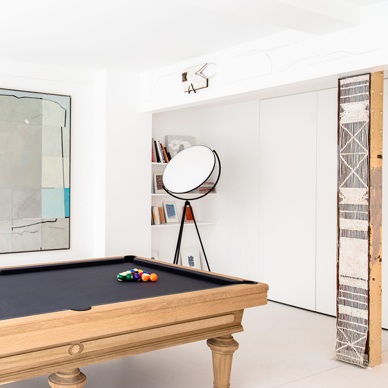 En surplomb, une composition murale de Gerd Kanz joue avec la lumière et la matière. Ce réseau de formes ajourées, entre structure et sculpture, filtre l’espace et dessine des ombres mouvantes, conférant à l’ensemble une présence à la fois architecturale et poétique.
