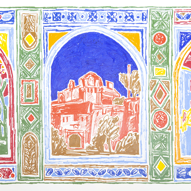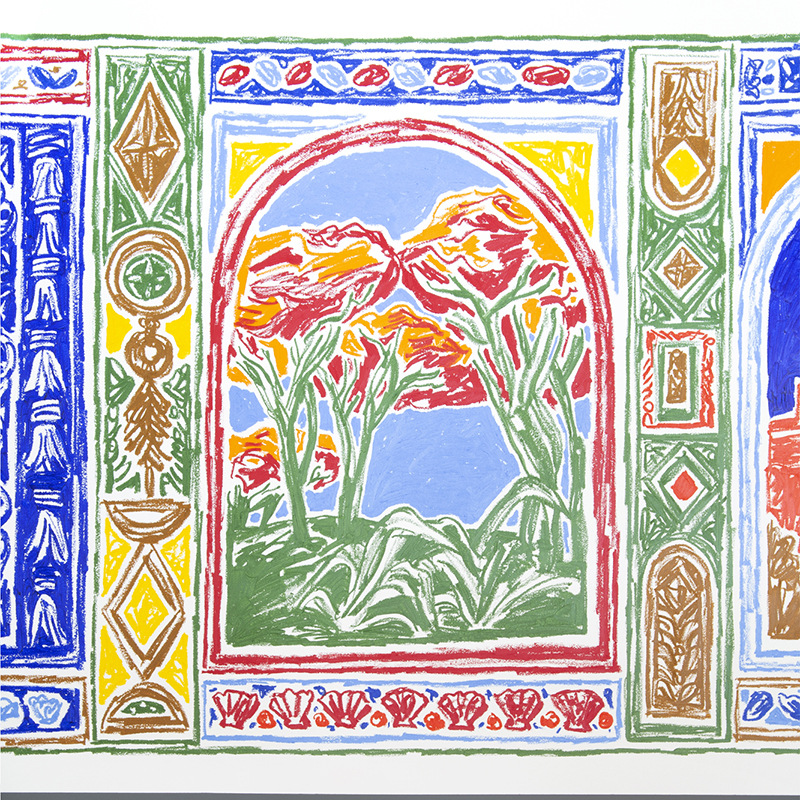 Armée d'un pastel gras, l'artiste vient recouvrir la forme d'un volume d'architecture en cohérence avec son motif. Ce mur arrondi se retrouve ainsi entouré de voutes.