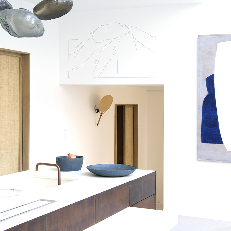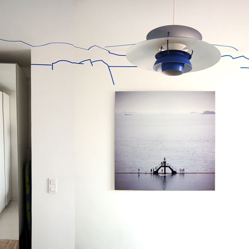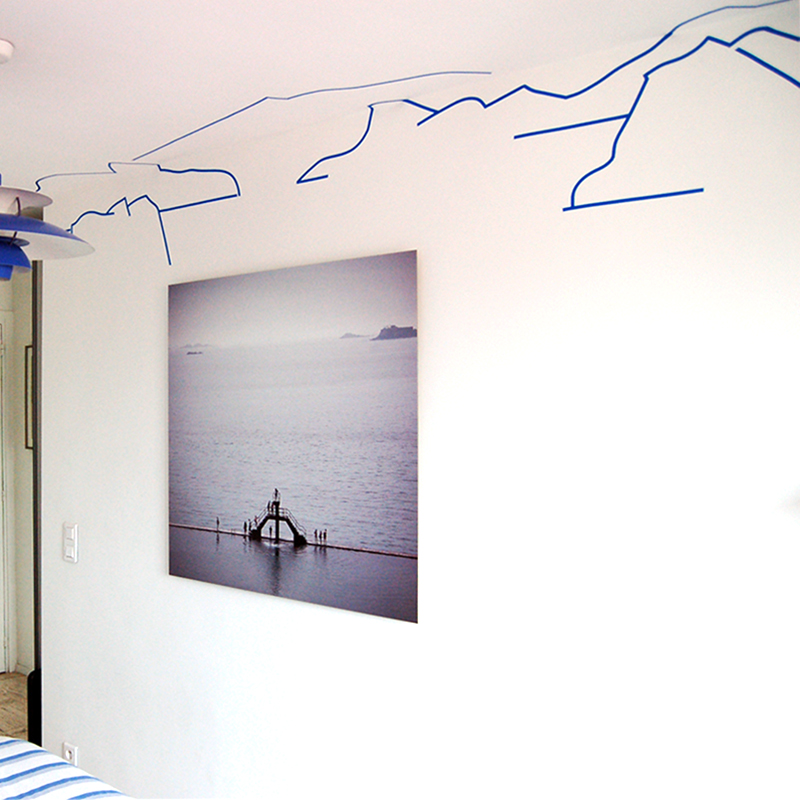 L’artiste devait faire face à un couloir « qui tourne » sur lequel on ne peut donc rien accrocher. Il décide de réaliser pour ce couple passionné par le Kenya les contours des 5 plus grands lacs kenyans. Toujours cette ligne, signature de l’artiste, des glacis de bleus très en nuances et de la simplicité.