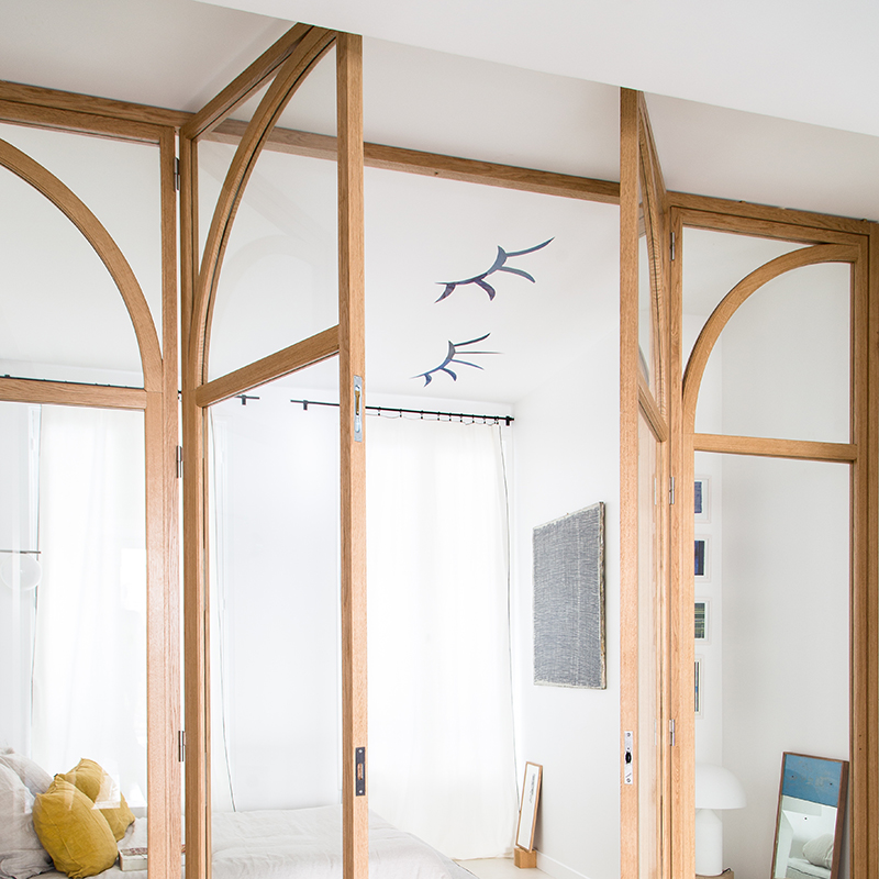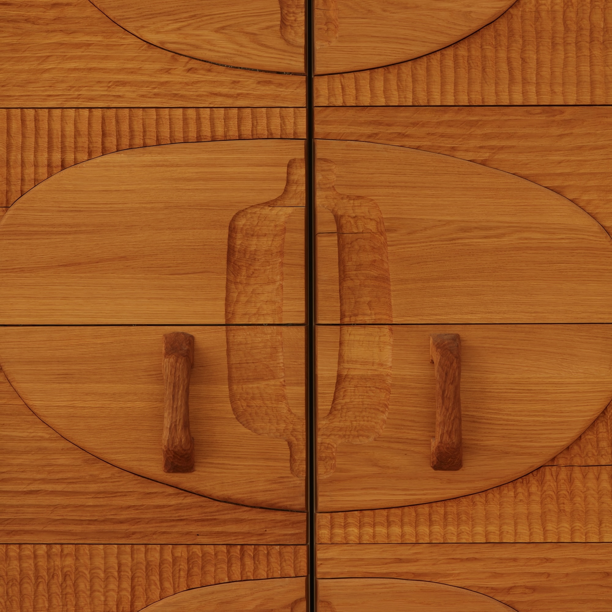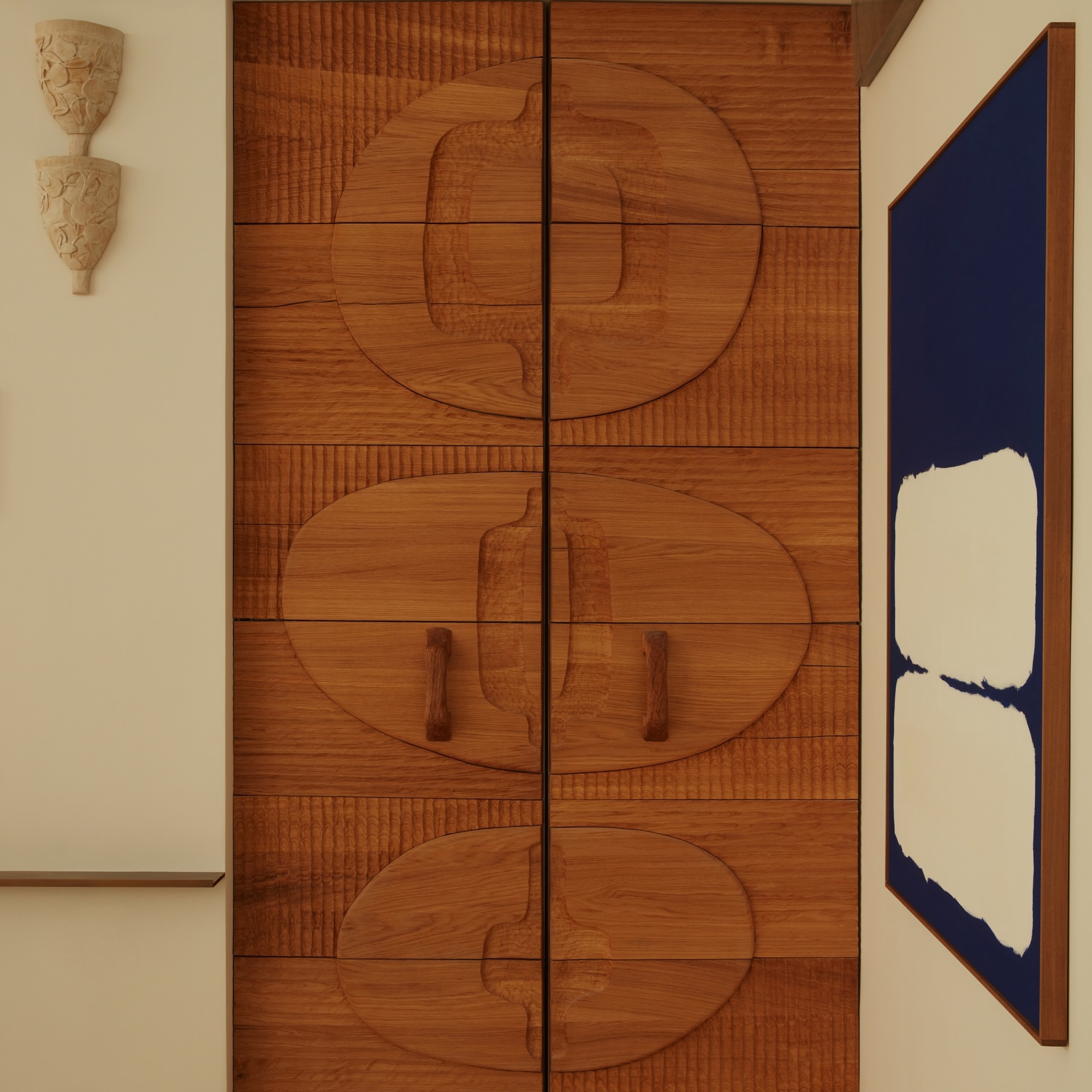 Entrer dans le cercle, entre formes vernaculaires et influences à la Brancusi, avec cette double porte en panneaux de chêne sculpté du designer et ébéniste Eloi Schultz, menant à l’espace réserve de la galerie