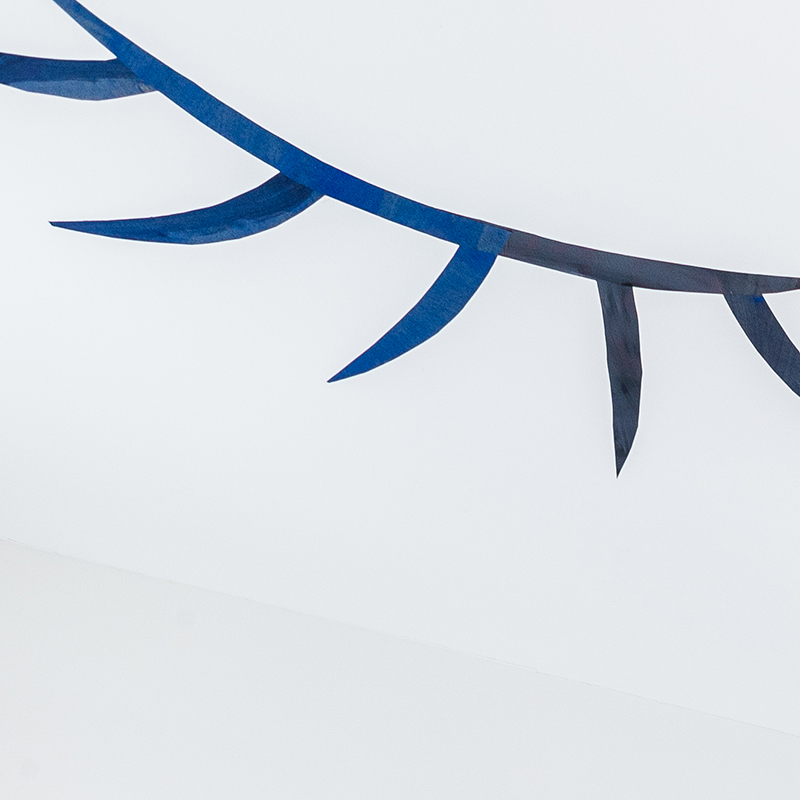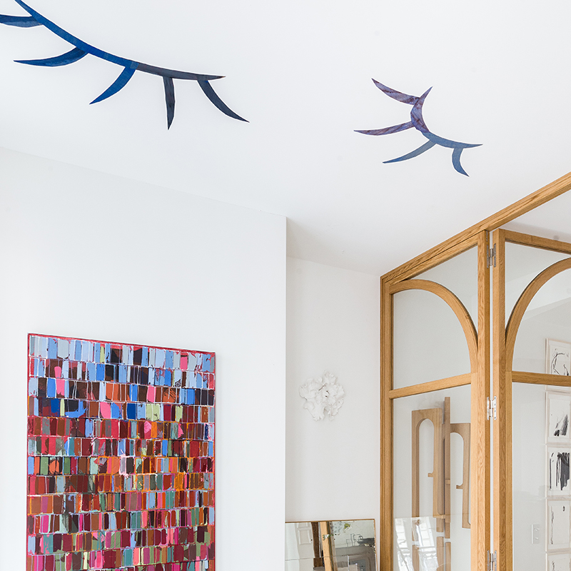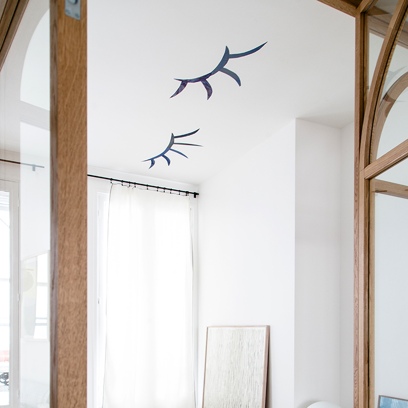 Le collage est une pratique courante chez Marie-Claude Bugeaud. Souvent issus des chutes de ces recherches diverses, on le retrouve souvent dans ses tableaux, mélangé à sa peinture. Une forme, une vraie une délicatesse, un presque-rien qui change tout, un clin d’oeil…c’est avec beaucoup de poésie que Marie-Claude est venue déposée « juste un regard » sur ce plafond…