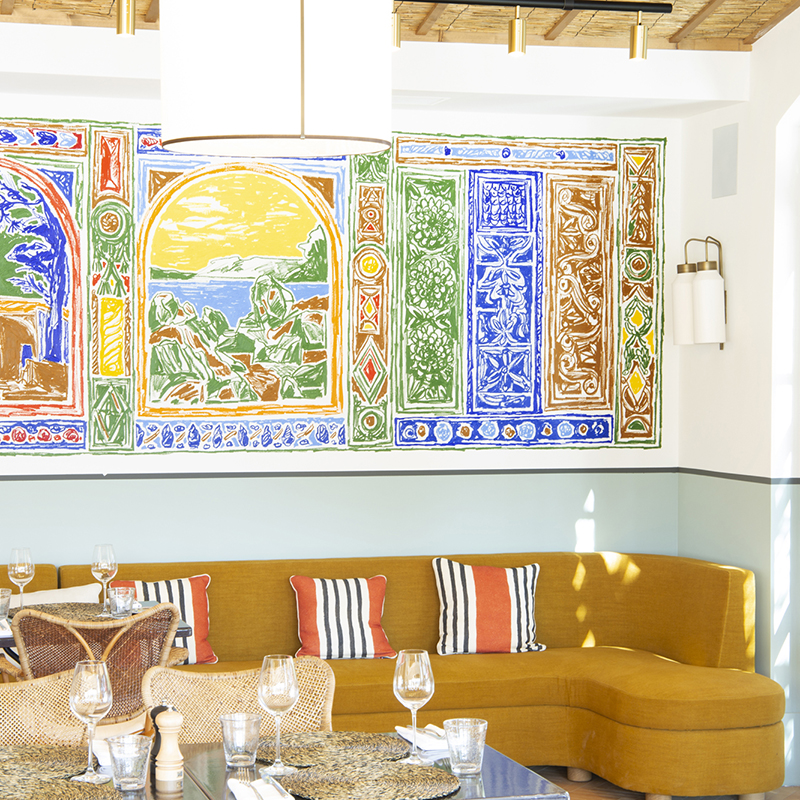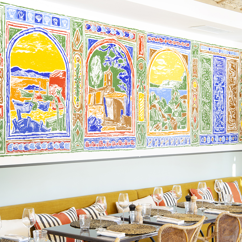 lexandre Benjamin Navet imagine pour cet établissement de Saint Tropez 6 panneaux qui offrent des vues typiques de la région : pin parasol, rocher, clocher de l’église, etc. accompagné de motifs d’ornements de l’univers marin (coquillages, crustacés, etc.).