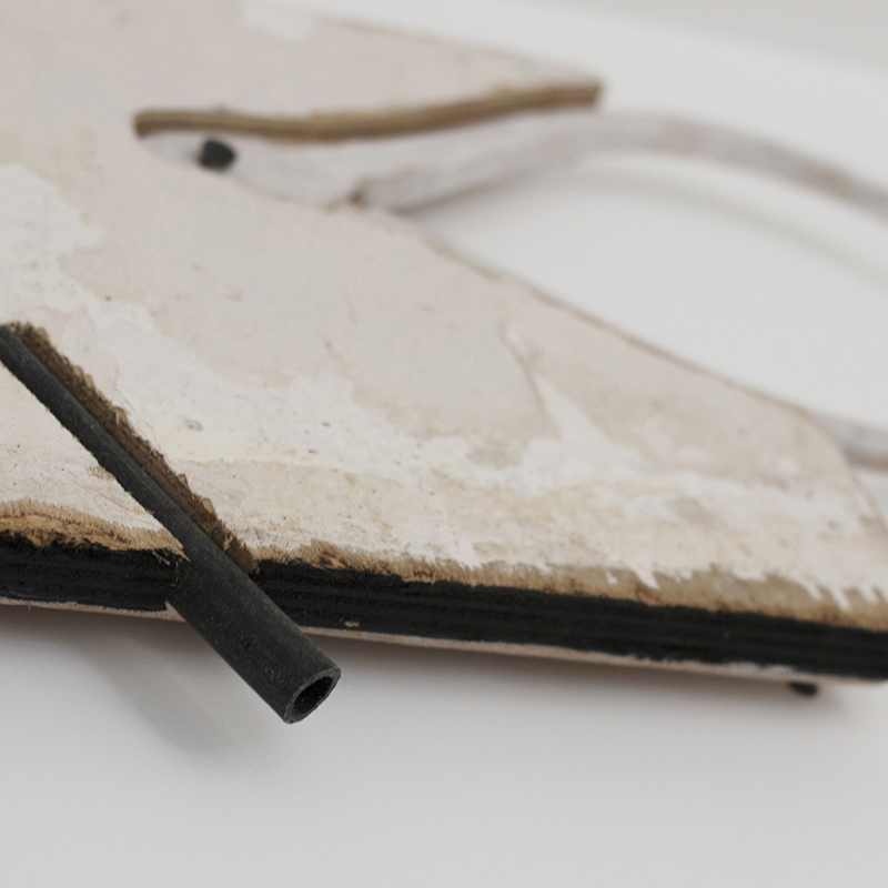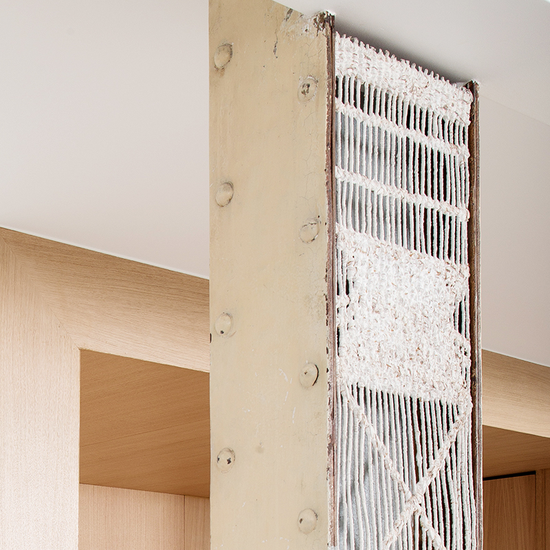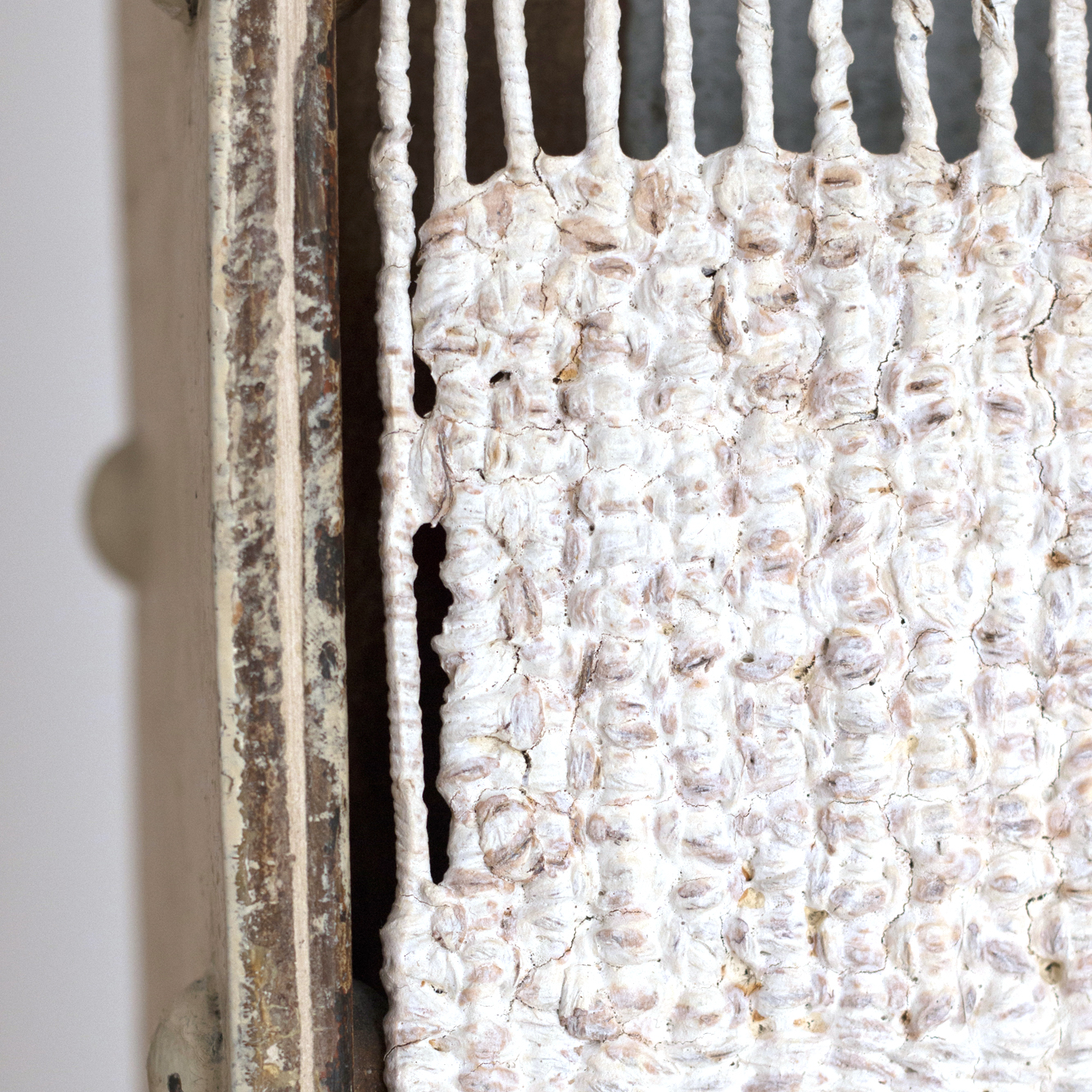 Nadine a une formation de licière, c’est-à-dire qu’elle tisse. Elle mélange des matériaux contemporains et variés (fils de fer, de lin, de caoutchouc) et des techniques ancestrales de tissage. Pour cette poutre métallique Eiffel, Nadine a choisi de créer une trame aérée, irrégulière et rigide. Patinée en blanc, l’artiste a mélangé des pigments, du gesso, du plâtre à cette trame en fils de fer et de lin. Le fer rouille, le tissage se tend et l’oeuvre vit avec le temps…