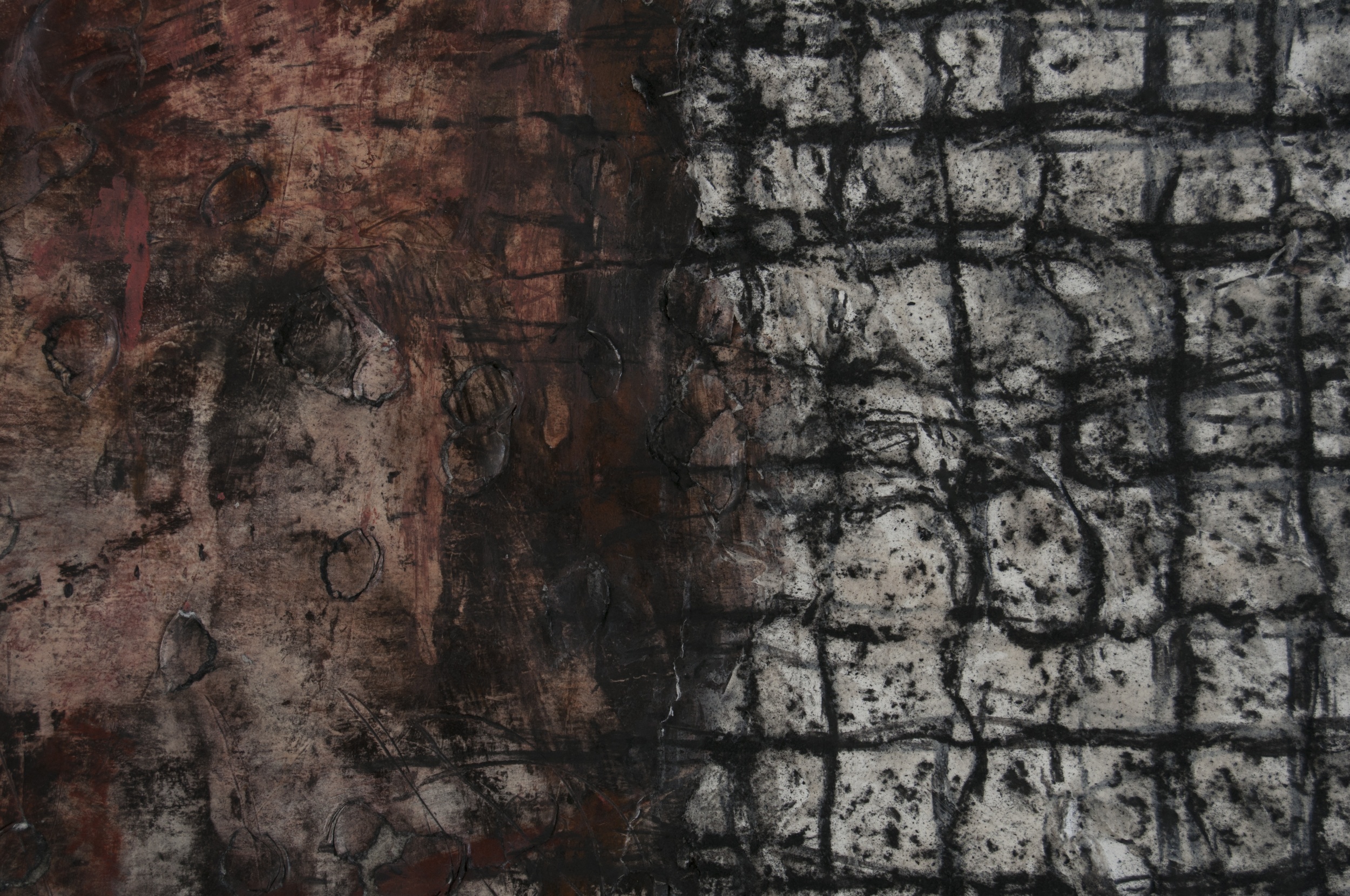 Les grands papiers sont préalablement préparés par l'artiste, enduits puis martelés, la matière devient plus structurante et structurée. Puis l'artiste vient tracer ses fils. De longues lignes monochromes dessinées au fusain qui semblent suspendues sur le papier comme un rideau de matières.